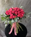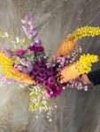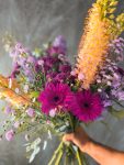 Μια ανθοδέσμη με σύγχρονο χαρακτήρα, που συνδυάζει φούξια ζέρμπερες και χρυσάνθεμα, λιλά δελφίνιουμ, απαλό ροζ άστερ, εντυπωσιακό ερεμούρο (Eremurus) και ευκάλυπτο. Οι χρωματικές εντάσεις και οι φυσικές υφές συνυπάρχουν αρμονικά, αποδίδοντας ένα αποτέλεσμα με καθαρή αισθητική και δυναμισμό.